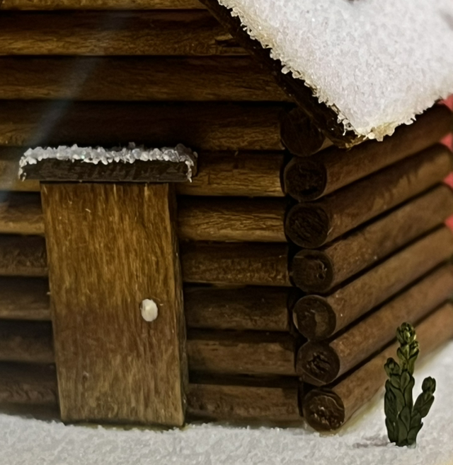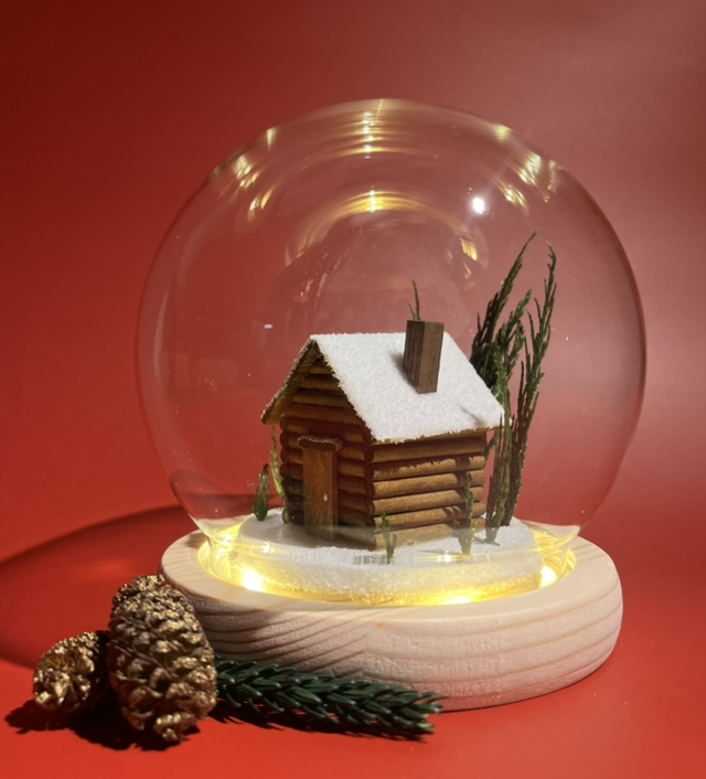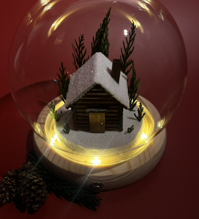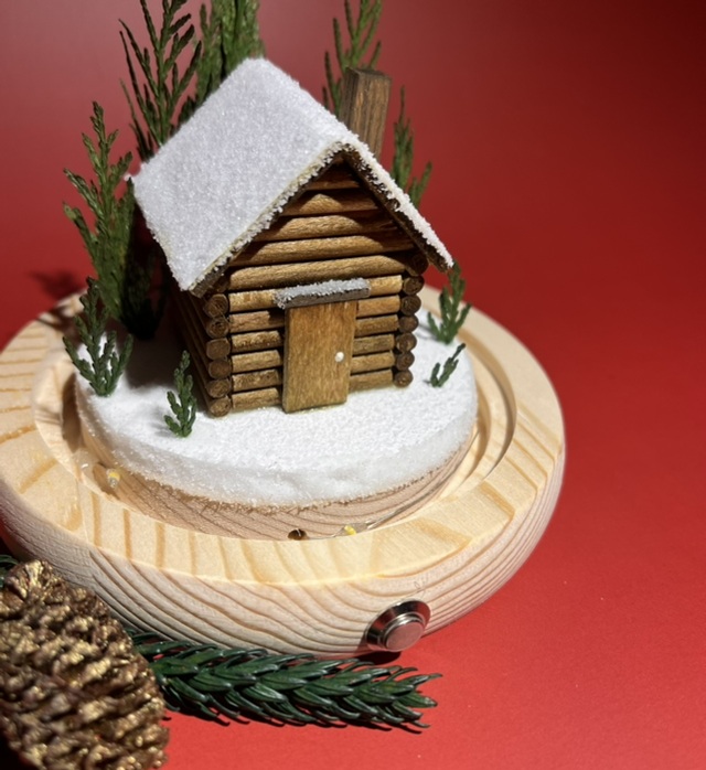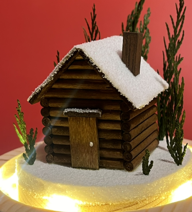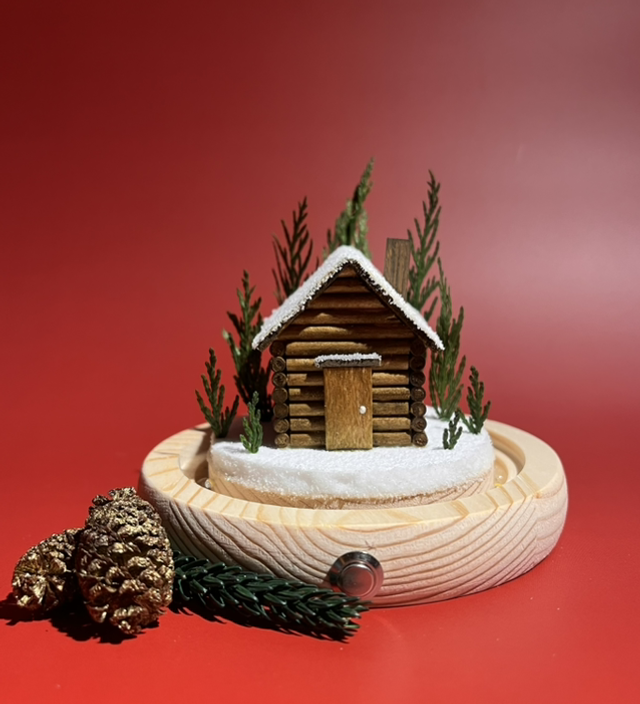 Papier cartonné, bois Balsa, acrylique, peinture 3D, neige synthétique, perles, végétaux stabilisés (cyprès).
