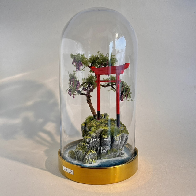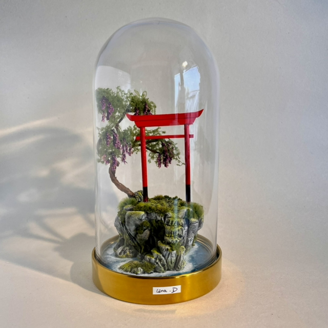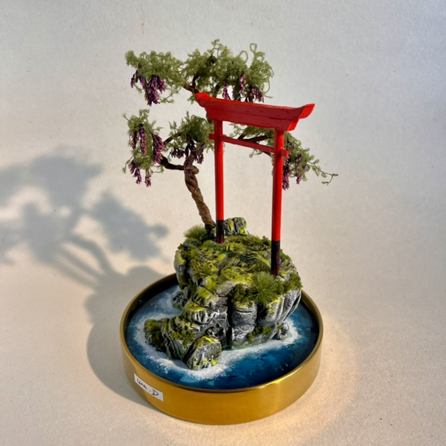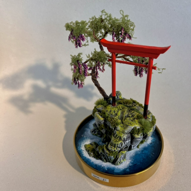 Matières utilisées : Acrylique, bois, argile autodurcissante, fil de fer, mousse végétale, herbe synthétique.